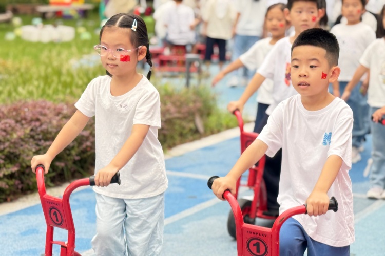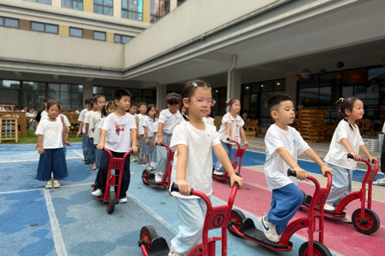 升旗仪式后,主持人带领幼儿回顾“九三大阅兵”的震撼场景,点燃幼儿们的参与热情。接着各班以方阵形式展开队列展示,大班幼儿率先登场,大1班的滑板车方阵、大2班的平衡车方阵、大3班和大4班的三轮车方阵、大5班的小推车方阵依次从彩虹跑道起点亮相,在升旗台尽头退场。随后中班幼儿接力候场,中1班的海绵棒、中2班的呼啦圈、中3班的皮球、中4班的呼啦圈方阵也以饱满的状态完成展示。每一个方阵都展现出“小小军人”的飒爽风姿,观礼区的幼儿们不时发出欢呼与赞叹。